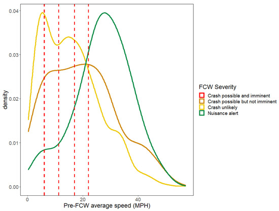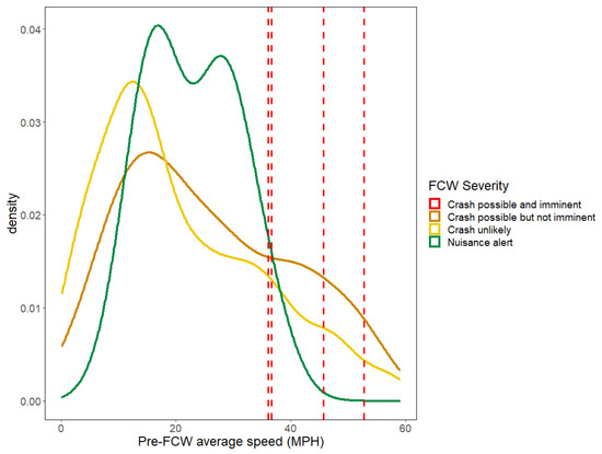 Probability density curves for pre-FCW vehicle speed by FCW severity for highway driving. Dashed vertical lines indicate individual imminent alert speeds.