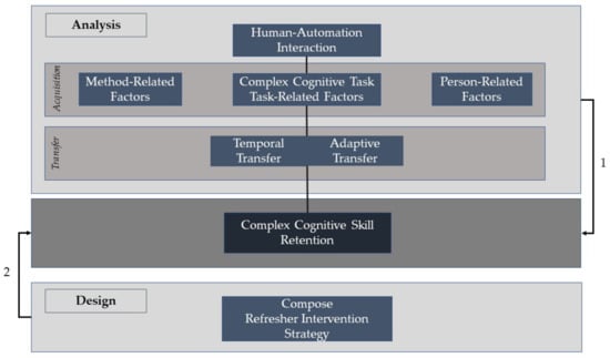 As stated in [,], although acquisition, retention, and the transfer of skills are separate phenomena, to fully understand the potential impact of an intervention in the acquisition, retention, and transfer of complex cognitive skills, it is critical to consider each phenomenon in the analysis. The findings can be used by industry and training providers as resources to design training and refresher interventions based on a systematic approach that can help to mitigate complex cognitive skill decay in companies in high-risk industries. A systematic approach [] means to first derive relevant factors for complex cognitive skill decay via analysis, and second, to compose a refresher strategy based on these findings (Figure 1).