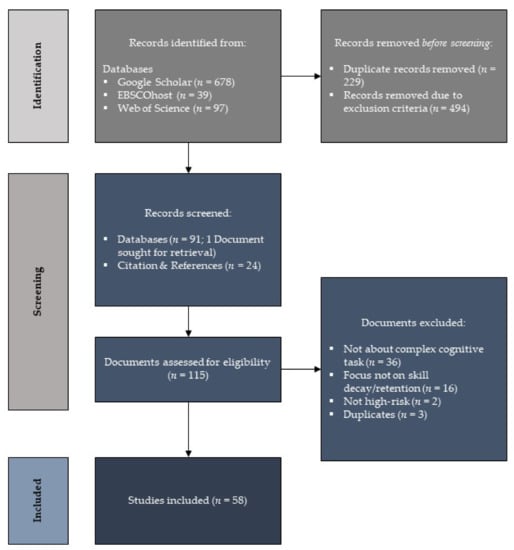 Before the studies were selected for the final analysis, the terminology was defined, and inclusion and exclusion criteria were established. Studies were included if they related to complex cognitive tasks and skill or knowledge decay or retention, refresher training or intervention, and high-risk domains. Studies were excluded when they did not relate to high-risk domains or complex cognitive tasks (e.g., when they related to senso-motor and motor tasks), and when they did not relate to skill or knowledge decay or retention. In addition, studies that did not consider refresher training or interventions in high-risk domains for complex cognitive tasks were excluded. Definitions of complex cognitive tasks, skill decay/retention, refresher intervention, and high-risk industry used for the scoping review can be retrieved from Table 2.