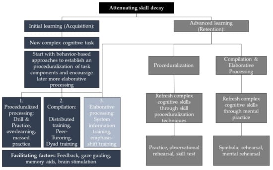 Other behavior-based methods contained the strategy of compilation, which is purposed to speed up and make performances more accurate []. This can be accomplished by distributed training over several time-points, the training of dyads, peer-tutoring, or error training. Past research acknowledged that distributed training over several time-points resulted in minimal decay of a cognitively complex skill after a long-term non-use period [,]. Further, those who undertook dyad training, in which each individual of the dyad acquired half of the skills needed for a complex task separately, but could train both halves together, did not differ in their performance from those who were trained individually after a non-use period [,]. Tutors who taught other individuals in peer-tutoring on a complex task could retain more skills in the long-term compared to individuals who did not teach others [,]. It was argued that these methods provided individuals with more time to process complex cognitive tasks and that individuals were able to form effective cognitive strategies [,].