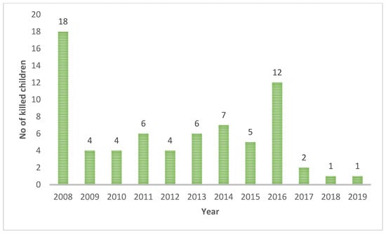 Over the last decades, the involvement of children in road accidents with severe injury outcomes has raised major concerns for local and national road authorities as well as for the general public. In Scotland, recent evidence suggests that children are indeed involved in accidents that are associated with different levels of injury severity. In 2020, approximately 490 child casualties were reported, which accounts for about 10% of the total casualties in all road accidents. Out of these, six children suffered fatal injuries, while 176 children were reported as seriously injured []. Figure 1 shows the number of children (under the age of 15) who were killed annually as a result of land transport accidents in Scotland between 2008 and 2019. In 2008 and 2016, the largest numbers of deaths were recorded; whereas, since 2017, the number of child fatalities has significantly decreased, but it is still above zero. These statistics clearly show that, despite the significant advances in safety policies and crash-avoidance technologies and systems, children continue to be a particularly vulnerable group of road users.