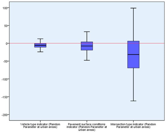 Boxplots illustrating the random parameters’ distributions in the accident injury severity model for urban areas (the lower and upper limits of the box reflect the interquartile range, the thick line in the middle of the box represents the median, the red line indicates the zero value, and the whiskers are defined by the minimum and maximum values of the distribution).