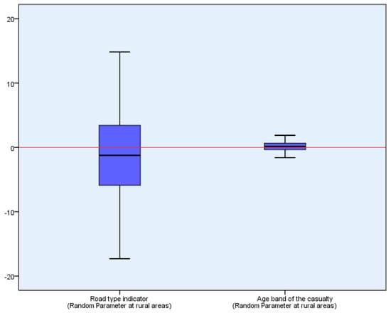 Boxplots illustrating the random parameters’ distributions in the accident injury severity model for rural areas (the lower and upper limits of the box reflect the interquartile range, the thick line in the middle of the box represents the median, the red line indicates the zero value, and the whiskers are defined by the minimum and maximum values of the distribution).