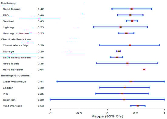 Agreement between safety priorities and safety practices was slight to moderate for the machinery items (Κ = 0.23–0.43), with high variability around the Kappa statistic for checking lighting and markings before taking a farm vehicle on the road (Figure 1). Slight to moderate agreement was observed for the safety practices and priorities related to pesticide and chemical use (Κ = 0.20–0.64). Using hand sanitizer showed the strongest agreement at 0.64 and showed no measurable variability around the Kappa statistic; the questions appeared to be interpreted as identical. For the safety practices and priorities related to buildings, the agreement was a bit higher, with some items being in the moderate level of agreement (Κ = 0.25–0.53); however, the variability was high.