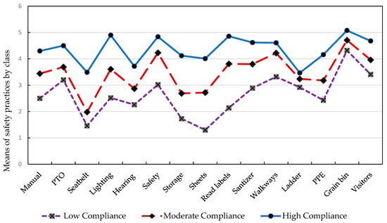 The agreement between priorities and practices was low to moderate, even though operators scored consistently high on recognizing safety priorities. The variability in the Kappa statistics suggested heterogeneity in the sample of operators and that the existence of subgroups was likely. The moderately safe group was the majority at 61%. The low safety group comprised 15% of the sample. There were clear differences between safety practices related to grain bins and ladder safety, where class agreement was high, and wearing a seatbelt when in a tractor with a ROPS and having safety data sheets available for chemicals and pesticides, where class agreement was low. Educational training on grain bin safety has increased awareness, but grain bin engulfment deaths have not decreased over the past decade and engulfment incidents are likely underreported [26]. As was observed in a 2018 study by Irwin and Poots, there was high variability in the frequency of exercising specific safety behaviors [27]. In that study, investigators used tractor scenarios and asked about working under certain conditions where safety might be compromised [27]. The reasons for doing or not doing an activity were often related to the perception of risk; some activities were assumed to be unsafe and were not undertaken. Despite the variability in the exercise of the safety practices we asked about, the parallel lines in the LPA plot suggest that these groups are distinct.