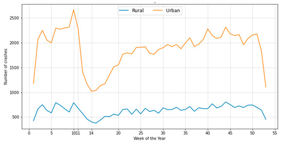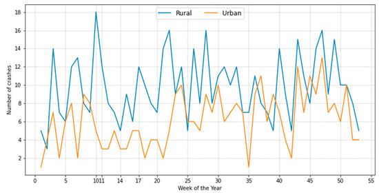Figure 1 and Figure 2 present the distribution of total crashes and fatal crashes by location, respectively. Figure 1 shows that the shelter-in-place period recorded a significant decrease in the number of total crashes particularly in the urban areas and Figure 2 reveals that most of the fatal crashes occurred in rural areas. The trend seen in Figure 1 reveals that the total number of crashes reduced significantly after week 10 and then began to increase after week 14—recall that shelter-in-place began in week 11. Interestingly, week 10 (the week before the statewide shelter-in-place order was issued) recorded the highest number of crashes in the year and the highest number of fatal crashes in rural areas in the year. The pattern of fatal crashes shown in Figure 2 indicates that there was a significant decrease in fatal crashes between week 10 and week 14, but the trend has been similar for both rural and urban areas for the greater part of the year.