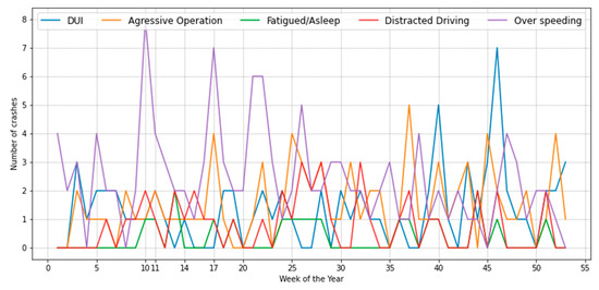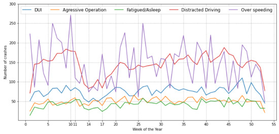 Figure 3 and Figure 4 show the distributions of total crashes and fatal crashes throughout the calendar year 2020 by some of the major primary contributing factors. Speeding was identified as the leading contributing factor responsible for all crashes and the highest number of fatal crashes. The peak of fatal crashes due to speeding was recorded in the week before the shelter-in-place order went into effect. Distracted driving recorded a high number of crashes, but the fatal crashes were minimal even in the week preceding the shelter-in-place order. The figures indicate that the shelter-in-place order had very minimal effect on crashes and fatalities resulting from speeding, driving under the influence of alcohol or drug (DUI), fatigue driving, and distracted driving. Aggressive driving-related fatal crashes were however observed to increase after the shelter-in-place.