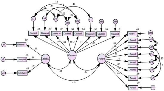 The initial hypothesized measurement model had eight items for Awareness, seven items for Lifestyle, and 11 items for Causes.