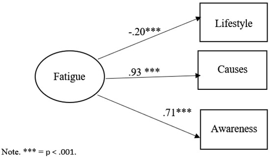 There exists a relationship between awareness of fatigue factors (Awareness) and the overarching construct of fatigue. (H3: βAwareness ≠ 0).
