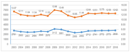 In Spain, all occupational accidents resulting in one or more day of absence should lead to electronic notification of the Labour Authority through the Delt@ platform. The platform collects all the official occupational accident reports daily communicated by the employers of the worker injured. For the current study, the Spanish Government provided 42,878 occupational accidents corresponding to all occupational accidents reported by male teachers in Spain from 2003 until 2018. Figure 2 depicts the total number of occupational accidents (Blue) and the incidence rates for male teachers (Orange) in the period analysed. The trend over the last five years appears to be quite stable.