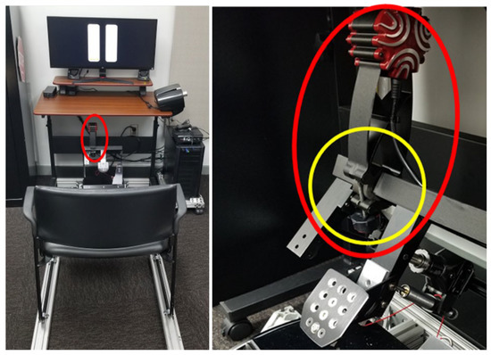 The Fanatec ClubSport V3 pedals set was utilized, where the brake pedal’s adjustable damper was set to zero to allow the pedal to move freely []. The resistance of the pedal was verified by a subject matter expert. The pedal travel was set to allow for the maximum amount of pedal travel (1.75 in). The typical pedal travel of a brake pedal on a passenger vehicle is about 2 in (measured from a 2012 Toyota Camry and 2022 BMW 330i).