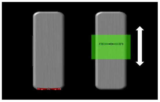 The Pedals Emergency Stop© interactive exercise provides repetition with emergency braking with ABS haptic feedback. The interactive exercise looks identical to Pedals Chase© and begins with a moving target on the gas pedal (see Figure 3 left). After a randomized amount of time, a brake target zone appears on the very top of the brake pedal (see Figure 3 right) and a loud, audible “Stop” prompts the participant to place the indicator in the target zone on the brake pedal. The target zone is located at the very top of the brake pedal and extends beyond the brake to encourage participants to press the brake pedal to achieve the pedal’s maximum travel.