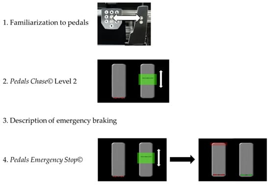 The Pedals Chase© interactive exercise uses dynamic targets on the visual representation of a gas and brake pedal (see Figure 2). The participant’s goal is to keep the indicator in the target zone while the target zone moves up and down first on the gas pedal and then on the brake pedal. Level 2 of this interactive exercise was used, where the target zone is 25% of the size of the pedal. To “pass” this task and move on to the next task, the participant needed to make less than three errors (leaving the target zone).