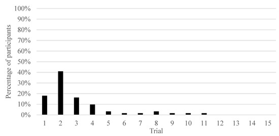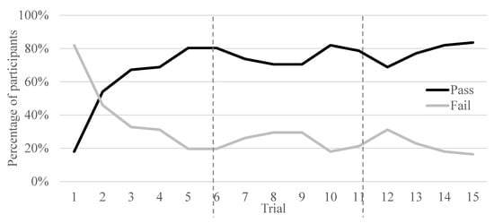 The percentage of participants that received a “pass” on each of the trials was tallied. The percentage of participants that passed dramatically increased over the first five trials from 18% to 80%. From trials six to 15, the percentage of participants that passed became more consistent, varying between 69% and 84% (see Figure 6).