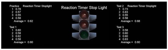 In terms of the feedback presented to the participants, it became obvious during the study that the results could be presented more effectively. DriveSafety, Inc. (Draper, UT, USA) has two interactive exercises that measure reaction time, both of which display feedback immediately after each trial and keep the results presented for the duration of the entire task. Reaction Timer Steering© measures the time that it takes a driver to turn the wheel either to the right or left in response to a stimulus. Reaction Timer Stoplight© measures the time it takes a driver to move their foot from the gas pedal to the brake pedal in response to a stimulus. During both interactive exercises, driver’s reaction times are displayed after each trial, continuously populating as the driver completes all 16 trials. The trials are grouped into sets of four, consisting of a practice with four trials and three tests with four trials in each test. The DriveSafety clinical simulators utilize three separate screens, where reaction times are displayed in groups of four on the two outer screens. See Figure 8 for an example of the results for Reaction Timer Stoplight© where the task is displayed in the center.