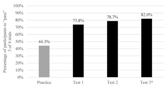 Percentage of participants to pass with the trials regrouped into sets of four with a practice, test 1, test 2 and test 3. * Test 3 only consisted of three trials because participants in the current study completed 15 trials.