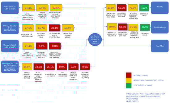 Figure 9). Three of the four Mobile Plant and Equipment MAE hazards have compromised CC prevention pathways, with two or more CC effectiveness measures being compromised by having a 50% or lower failure rate when the control is implemented.