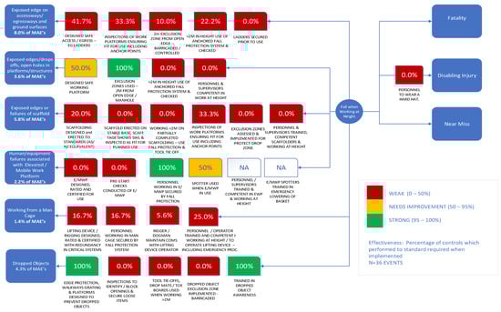 Figure 8), three of the control pathways (i.e., falling down, working from scaffolding, working from man cage) identified each Critical Control as being weakly implemented or not effective. For example, Falling from Scaffold identified three CCs as being implemented: design of the scaffold, inspections on standard of scaffold being built and scaffold foundation inspections; however, only the design CC was assessed as being only 20% effective. Similarly, when assessed in the overall context of the study, the CCs that had a high reliance on human performance (e.g., operating plant and vehicles, inspections, maintaining exclusion zones) had a higher rate of failure (