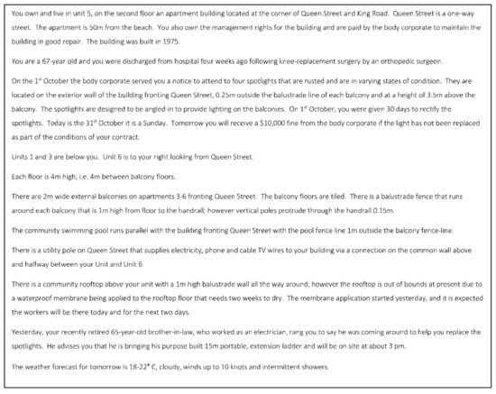 The critical hazards in the scenario were working at heights and simultaneous operations (i.e., the concurrent execution of more than one task). These were selected based on the findings of studies conducted by Marling [42], which identified them as commonly occurring mechanisms of injury and fatality.