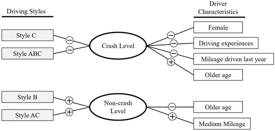 Illustration of modeling results with significant driver level characteristics. Negative signs indicate negative association and positive signs indicate positive association.