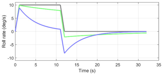 Model output of the SOMS model (blue line) and the Observer model (green line) in response to a sudden increase in roll rate (gray line) up to a constant rate followed by a deceleration back to zero. This shows that the semicircular canals respond to the onset of rotation (i.e., acceleration) and that this response subsides while rotation continues at a constant rate. As the response has waned, the deceleration at the stopping of the rotation causes an output below zero, which corresponds to a roll sensation in the opposite direction (i.e., the post-roll illusion).