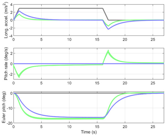 Output of the SOMS model (blue lines) and the Observer model (green lines) in response to a stepwise increase in longitudinal acceleration (gray line in upper panel) representative of a “static” takeoff run, where the engines are set at takeoff thrust with the brakes on and the aircraft starts to accelerate as soon as the brakes are released. The upper, middle, and lower plots show, respectively, longitudinal acceleration, pitch rate, and Euler pitch angle.