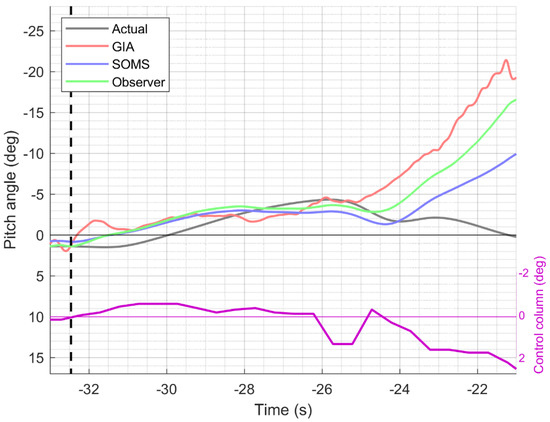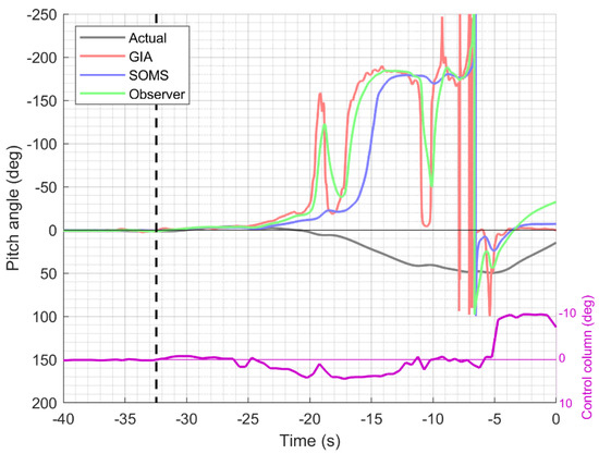 Time histories of the actual pitch angle (black), the computed GIA (red), and the perceived pitch predicted by the SOMS model (blue) and the Observer model (green), respectively. Note that the corresponding y-axis (on the left) is shown inverted to match the common aviation reference frame in which pitch up is positive. The x-axis shows the time in seconds until the end of the flight data recording. The vertical black dashed line indicates the TO/GA activation. The bottom part of the graph shows the time history (in purple) of the control column corresponding to the y-axis shown on the right (in degrees; positive is push down).