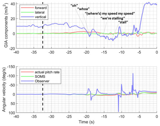Time histories of the recorded GIA components (upper panel, m/s2) and actual and predicted pitch rate (lower panel, deg/s). The PF’s callouts in the upper panel were copied from Appendix D within reference [1].