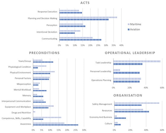 In the Preconditions layer, many factors are used. The largest category in both the aviation and maritime domains is awareness, with main factors including channelized attention, confusion and distraction, e.g., a chief officer being distracted by constant VHF radio conversations. The category competence, skills and capability is considerably more prominent in maritime occurrences, which is indicative of a higher contribution of inadequate experience, training and a lack of proficiency on ships. In aviation, the category team/group occurs relatively often. In particular, no cross-checking and speaking up by team members, regarding crew resource management problems in the cockpit, is prominent.