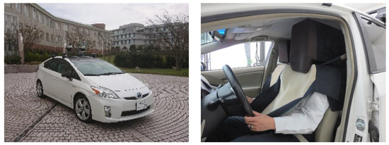 A Toyota Prius (ZVW30) was used as the CV and AV (Figure 2). For the case involving the AV, a sticker was attached to the vehicle to display the message “in automatic mode,” and a laser range finder was attached to the roof. We used the Wizard of Oz method [29,32] to conceal the driver to mimic a driverless scenario (Figure 2). The Wizard of Oz experiment method has been used within the field of robot–human interaction for a long period. In this method, the human is simulated to test robot behaviors. In the present study, a human hid in the driver’s seat, and manipulated the vehicle. The AV and the CV were controlled to have the same vehicle behavior by automatic running.