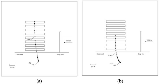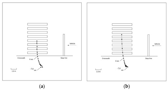 The time at which the vehicle stopped at the stop line in front of the crosswalk was defined as 0 s. We analyzed the pedestrian’s movement from −7.0 to 3.0 s (during this period, most pedestrians had finished crossing). The average position of the pedestrians at each time point is defined as follows: