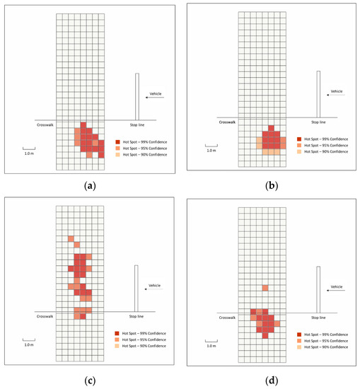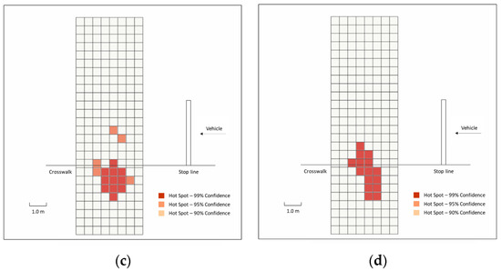 Hot spot analysis of pedestrian’s position in Group 1 (CV) and Group 2 (AV). (a) Group 1 at −7.0 s. (b) Group 2 at −7.0 s. (c) Group 1 at 0 s. (d) Group 2 at 0 s.