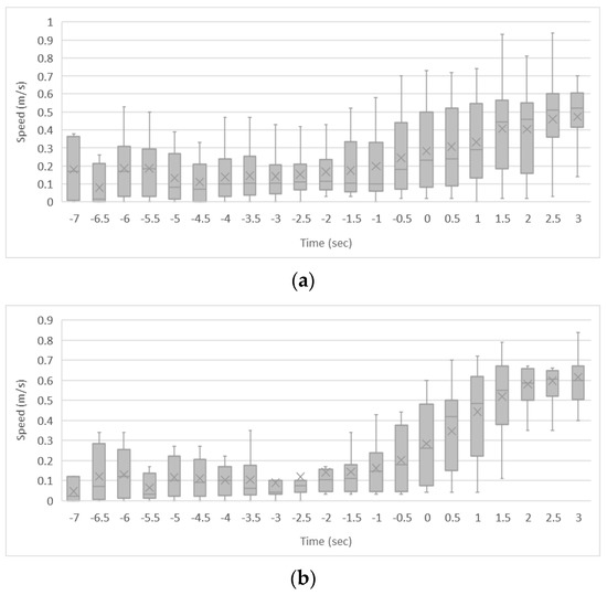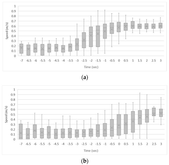 Pedestrian’s movement speed in Group 2a (high perceived safety) and Group 2b (low perceived safety). (a) Group 2a. (b) Group 2b.