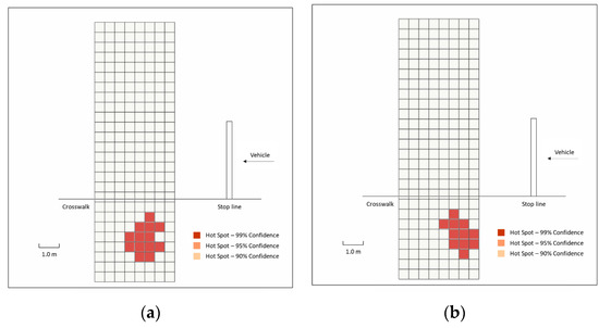 To examine the differences in pedestrian movement in each group, a hot spot analysis [33,34] was performed. The hot spot analysis can indicate the location with spatially clustered high and low values. First, we constructed a 0.5 m × 0.5 m mesh on the crosswalk. Second, we counted the number of participants for each mesh. Third, we corrected the number of participants in each mesh as the Getis-Ord based on the relationship with the adjacent mesh.