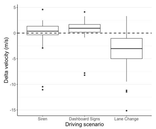 Effect of driving scenario on delta velocity; the dots represent outliers.