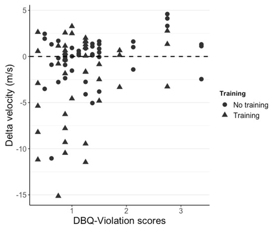 Table 2 presents the results of the multiple regression. When accounting for the effect of the other independent variables, driving scenario, training, and DBQ-Violation scores all had a significant impact on participants’ delta velocity. Specifically, when compared with the lane change drive, participants were associated with a significantly higher delta velocity in the siren drive (β = 3.39, p < 0.001) and the dashboard signs drive (β = 4.30, p < 0.001). Combined with the visualization in Figure 3, this indicates that participants tended to increase their speed right after the cybersecurity event occurred (note that a value of 0 indicates no speed change for delta velocity between after and before the cybersecurity event) in both the siren and dashboard signs drives relative to the lane change drive, in which they generally reduced speed. Similarly, participants who received training appeared to be more likely to reduce their speed (β = −1.59, p = 0.021) after the cybersecurity event occurred compared with those who did not receive training. Moreover, participants with higher DBQ-Violation scores were more likely to increase their speed after the occurrence of the cybersecurity event compared with their low-score counterparts (Figure 4).