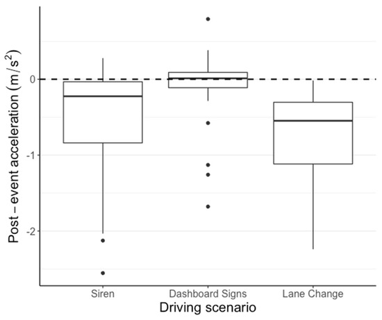 Effect of driving scenario on post-event acceleration; the dots represent outliers.