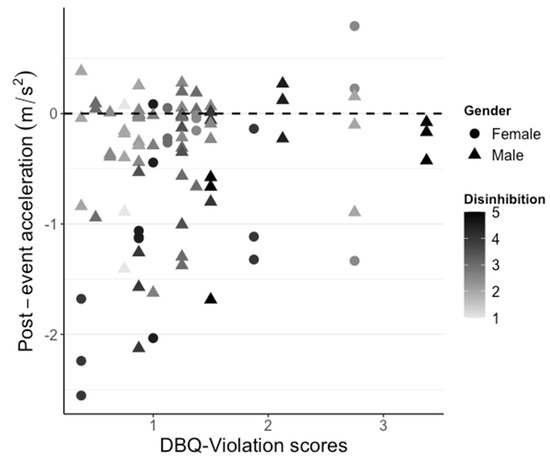 Effect of gender, DBQ-Violation scores, disinhibition on post-event acceleration.