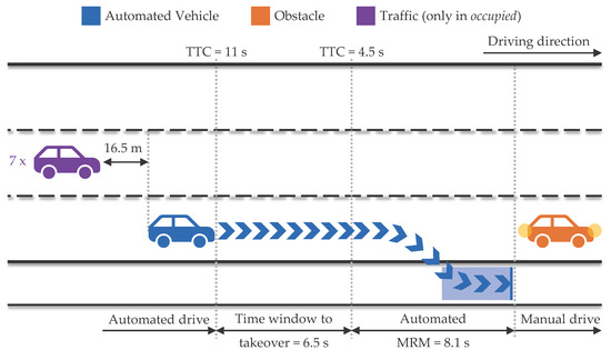 Two scenarios were implemented in the simulation that only differed in the presence of traffic in the middle lane, i.e., either with or without traffic (in the following referred to as the occupied or free scenarios). Both occurred on a three-lane highway with a shoulder lane while the ego vehicle was driving automated going 80 km/h in the right lane (see Figure 1). At a TTC of 11 s, a stranded vehicle with activated hazard lights caused the transition phase and the vehicle continued driving automated for 6.5 s, giving the driver time for a voluntary take-over. Automation either continued to perform an MRM, i.e., a lane change to the shoulder lane followed by braking until standstill, or disengaged in the case of driver intervention. A brake acceleration of 6 m/s2 was applied and resulted in a duration of 8.1 s for the MRM.