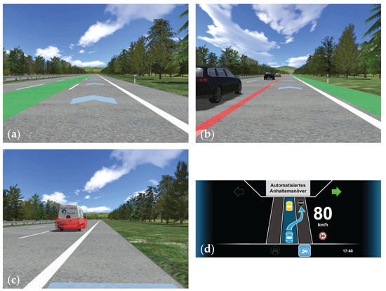 The focus of this study is an investigation from the driver’s perspective, i.e., within the vehicle. Furthermore, the approach is to use communication between the ADS and driver as a tool to improve transition phases with MRMs. According to the HMI framework by Bengler et al. [29], we are operating within the Automation HMI (aHMI). In the case of modalities, haptic and auditory signals are mainly used for warnings, whereas the visual modality was mainly applied for representing the automation state and results of the automation’s information analysis and decision and action selection processes [29]. The following hardware is frequently used as a visual interface: instrument cluster, monitor in center console, (augmented reality) head-up display, and LED-strip in the windshield [29]. A contact analog head-up display (cHUD), can be seen as an extension of augmented reality since virtual information is displayed at the correct location in the real environment [30] (p. 20). In general, the benefits of such systems are: