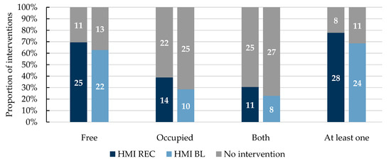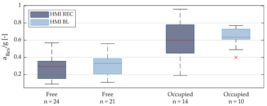 It can be assumed from these figures that in all cases, intervention rates with the HMI REC are higher than with HMI BL. An exact McNemar’s test was conducted to test this assumption and showed no significant difference in the proportions during both scenarios (free: p = 0.549, occupied: p = 0.344). Corresponding contingency tables can be found in Table 2. Hence, hypothesis 1a can be accepted and 1b rejected. Note that one participant was excluded from the analysis due to missing data in the baseline drive as described in Section 2.6 (n = 35).