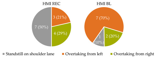 Results from [19,20] could be confirmed here again since a maneuver to the left is clearly favored by the participants over one to the right. A standstill maneuver in their own lane was not performed by any participant, but is a proposed MRM found in the literature (see Section 1.1). Even if the middle lane is blocked and a lane change to the left is dangerous, participants had the desire to overtake through that lane by slowing down, sometimes close to a standstill, to let the traffic pass before starting to change the lane. Two participants during the baseline and experimental drive did not wait while slowing down and maneuvered in between the convoy, causing an accident in each case. The positive effect of the HMI REC is a shift in the manner of intervention: more standstill maneuvers in the shoulder lane, less overtaking from the left, and an increase in overtaking from the right. The latter is not necessarily a positive effect since it is against the traffic law in Germany and passengers in the stranded vehicle could be located on the shoulder lane, which in turn was not the case in the simulated scenario.