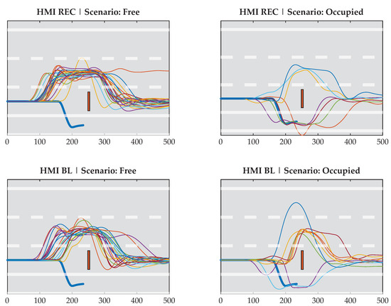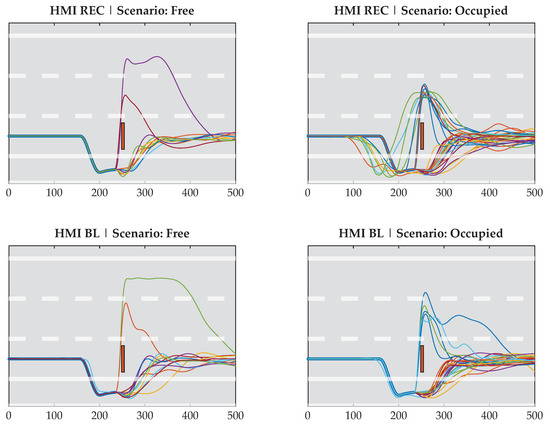 If there was no intervention or in the case of a standstill maneuver in the shoulder lane, the re-entry into traffic process was analyzed. During the free scenario, two participants decided to overtake the obstacle through the middle or left lane with HMI REC and HMI BL. This number is higher in the occupied scenario during the HMI REC, i.e., 10 overtaking maneuvers through the middle lane, as well as the HMI BL drive, i.e., 5 overtaking maneuvers through the middle lane including one overshoot (see Figure 11).