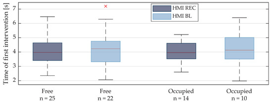 The first intervention after the beginning of the transition phase in the experimental and baseline drive are similar within the free scenario, i.e., M = 4.07 s (SD = 0.97) and M = 4.28 s (SD = 1.28), and also the occupied one, i.e., M = 3.97 s (SD = 0.78) and M = 4.11 s (SD = 1.23) (see Figure 7). One participant intervened after the MRM had started in the free scenario during the baseline drive and is marked as an outlier. Nine interventions happened in less than 3 s, which means before the audio message was finished.