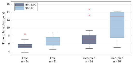 As shown in Figure 8, the values for the mean time to lane change with HMI REC in the free scenario are around 1 s slower than with HMI BL, with comparable standard deviations (5.50 s (SD = 0.95) and 6.63 s (SD = 1.27)). Mean values in the occupied scenario are higher with both HMI concepts, while HMI BL is higher than HMI REC (10.85 s (SD = 3.68) and 7.84 s (SD = 2.84)).