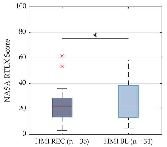 NASA RTLX scores. Outliers are marked as red crosses. The asterisk represents a statistical significant difference (p < 0.05).