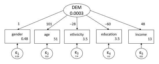Demographics (“DEM”) was created as a latent variable—one not directly observed—and was analyzed through the Structural Equation Modeling feature in Stata 16. Five variables taken from NHANES were used to build DEM: “riagendr” (gender), “ridageyr” (age), “ridreth3” (ethnicity), “dmdeduc2” (education), and “indhhin2” (income). Techniques used for these types of variables followed standard reported SEM modeling guidelines [40]. Table 5 and Figure 3 present the Stata output for the model as well as the path diagram created by it. It is crucial to clarify that the SEM built and analyzed a latent variable and not the typical dependent variable used earlier—hearing condition.