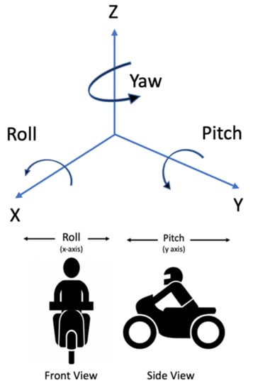 In this experiment, the movement of the motorcycle was measured, which we called “MC movement pattern”. The pattern of the MC movement was measured using the Inertial Measurement Unit (IMU) device Genuino 101. It is classified as a learning and development board that runs on the Intel Curie Module and can process real-time data useful in monitoring movement patterns. It is a programmable device that captures and processes the X (roll), Y (pitch), and Z (yaw) movements in real-time with a 3D model to simulate the motion. As can be seen in Figure 2, pitch refers to movements in the posterior-anterior (PA) plane, while roll refers to movement in the medial-lateral (ML) plane. Since the data gathered from accelerometers are analog, the device was programmed to automatically translate the XYZ movement readings into digital data. Although the device collected XYZ data, only the XY data were used in this study.