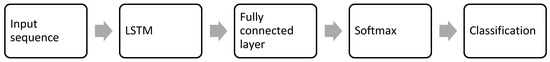 Shown in Figure 5 is the time series calculation of the input sequence at time step t. This is denoted by , with 32 features and n number of frames or time steps applied through the long short-term memory (LSTM) blocks. The hidden state, which is also the output state, is denoted by and the cell state is denoted by at time step t. The hidden state is a vector with a length equal to the number of hidden units.