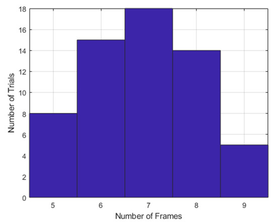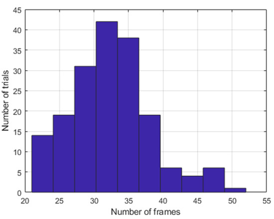 The number of samples of the roll and pitch signal varies from 529 to 1268. Shown in Figure 4 is the distribution of the number of frames for the different trials. For each set of data, the time–frequency representation of the roll and pitch is computed by windowing using a Hanning window with 32 samples and 8 sample overlaps, resulting in 32 frequency samples by n number of frames, where n varies from 21 to 52.